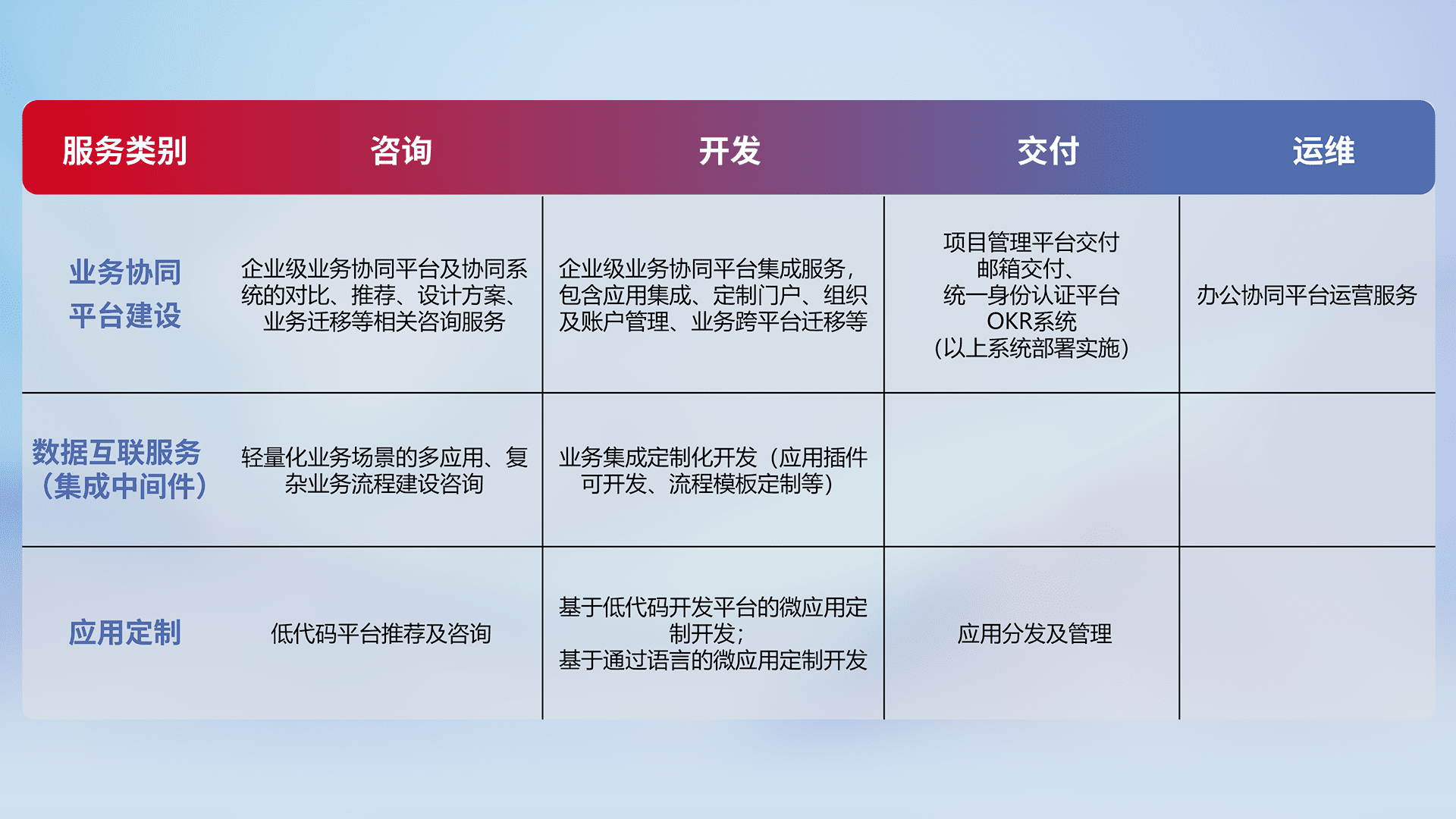 针对钉钉、、企微、、、、IDaas等平台级产品提供产品的规划、、、方案、、交付、、、定制化开发等服务,,实现如统一协同办公、、、、智能客户服务、、、、混合会议管理、、智能数据查询、、等业务场景,,,实现数字化转型。。。